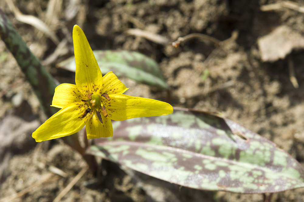 Trout lilies are small plants with one or two 3"-7" lance-shaped leaves growing from the underground corm, or small bulb. Each leaf tapers at the ends, and is a dull green mottled with greyish-purple spots that often fade as spring advances. A single flower is produced on a 4"-8" stem growing directly from the base of the plant. The flower has six backward curving petals and protruding stamens, and the whole flower often appears to be pointing downwards. There are 23 species of Erythronium lilies native to North America, and our local trout lily has a yellow flower, but other species can have pink or white flowers. Erythronium lilies are abundant in eastern woodlands, the Rocky Mountains, wetter parts of the Great Plains and Pacific states.