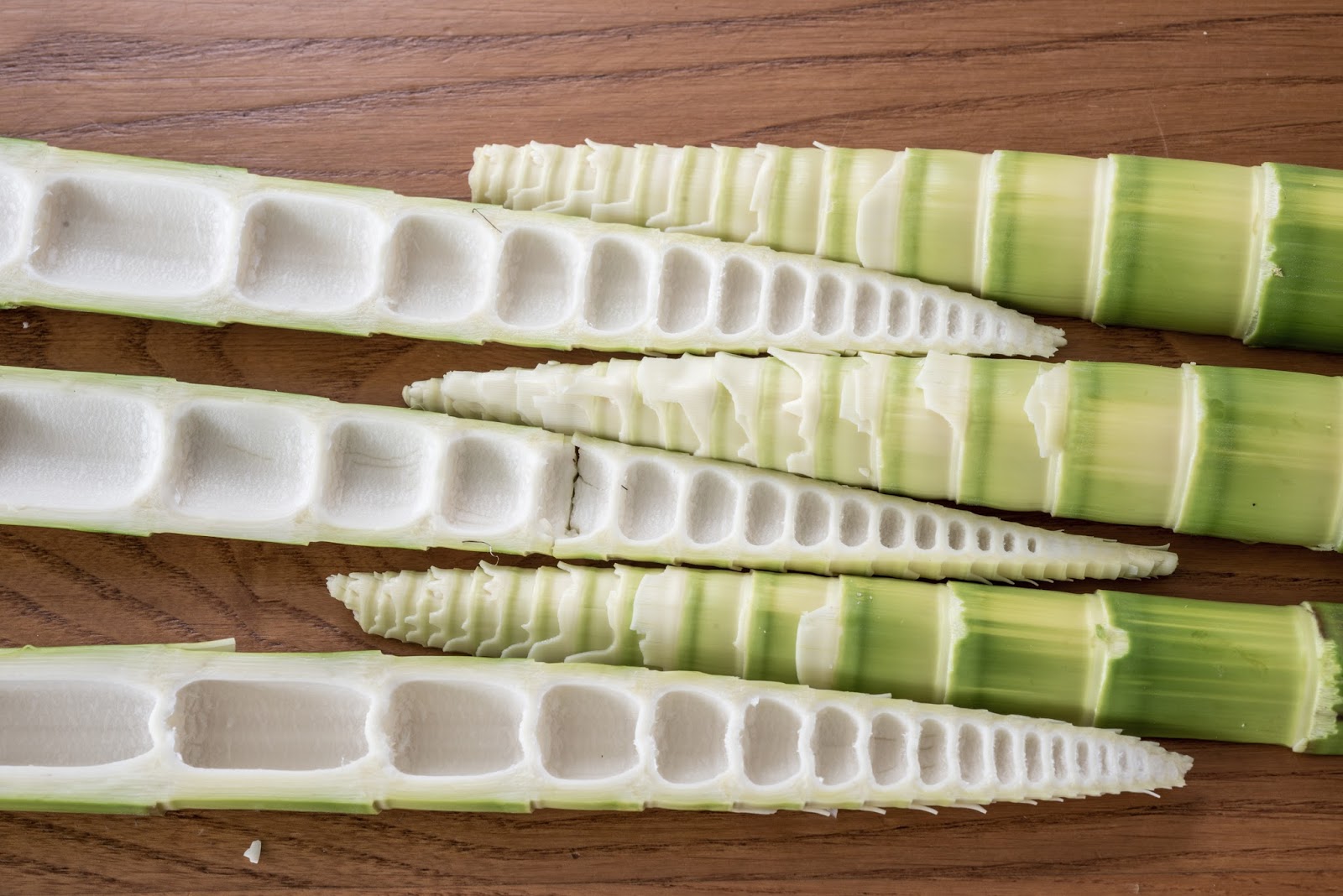 emerging shoots between the mature stalks. The shoots have a sheath covering them when they first emerge, and it is striped yellow, green, and a bit of purple. This leafy sheath should be removed, and we slice the shoot lengthwise first before sliding a thumb under the chambered shoot and the sheath; it should come apart quite easily. We then boil the split shoots for about 15-20 minutes in water with added rice or rice bran, which is the traditional Japanese way to prepare