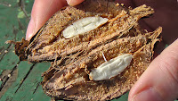 The seeds are black, comma-shaped and about 1/8" long. By pulling along the dry, brittle stems and along the seed pods, the seeds will fall into your hands or a waiting bucket. Many seeds will fall to the ground, but you should not feel like you are spreading the garlic mustard, since otherwise ALL of the seeds would have fallen to the ground and spread the plant naturally.