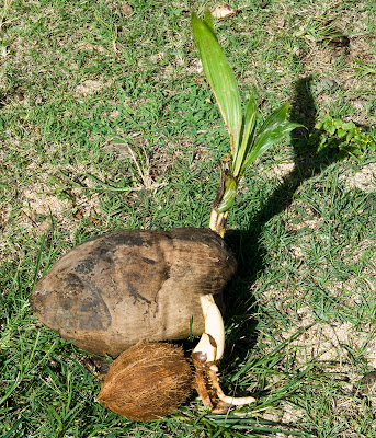 Matt Kirk also showed us how to find and eat sprouted coconut, a little known delicacy. Once the coconut has matured and fallen to the ground, the endosperm has solidified into the white "meat" of the coconut. This meat nourishes the developing plant embryo, providing energy for the plant to sprout. The consistency of the meat then becomes fluffy and spongy, almost like angel food cake, as it fills the cavity of the seed. The coconut produces a green shoot from one of the eyes on the shell, and a few roots to anchor to the ground. Once we peeled off the fibrous husk, Robert and Matt cracked open the hard shell so we could sample the fluff inside. The taste was a bit sour, almost sightly fermented, but also quite good. This was a wonderful, unique experience that we are happy to have tried.