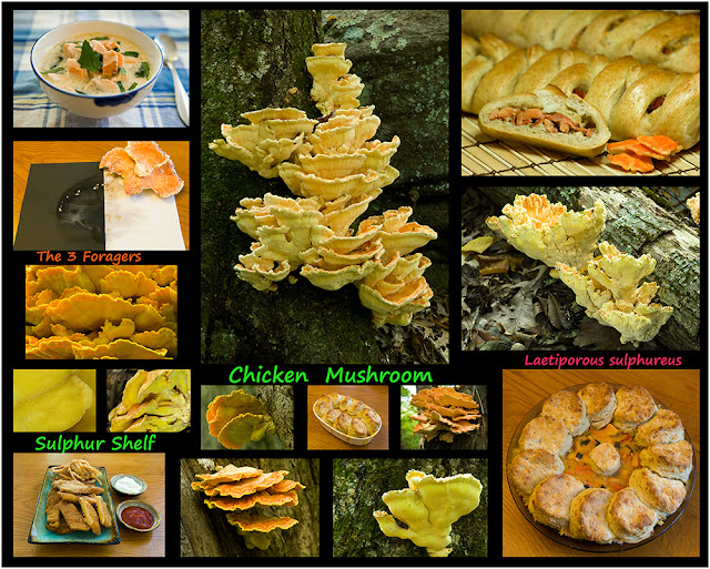 We find our chicken mushrooms (Laetiporus sulphureus) more often in the fall, but they can be found starting in the spring, though the summer, and into autumn. Our orange and yellow chicken mushroom can be a large specimen, providing huge amounts of food when the fungus is still young and tender. When the shelves are cut, they should ooze a little liquid and be juicy. Old, crumbly and bleached and faded chicken mushroom will taste like sawdust, and no amount of cooking or boiling will remedy that.