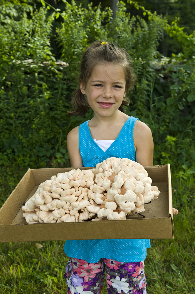 Chicken mushrooms are polypores, which means they have small holes, or pores, on their underside instead of gills. They rot the heart wood of hardwood trees here in the Northeast, growing on the upper portions of the tree trunk. A similar chicken, the pink and white Laetiporus cincinnatus, rots the roots and butt of the tree, and therefore appears at the base of a tree. We actually enjoy the taste of the pink and white chicken slightly more than the orange and yellow chicken, but both are very good edibles.