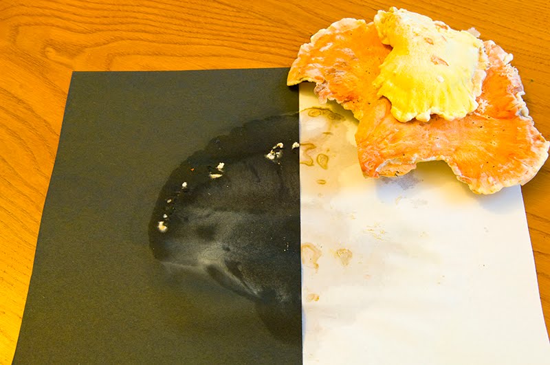 future identifications. This mushroom, however, he recognized as a chicken mushroom, or sulfur shelf (Laetiporus sulphureus), or chicken mushroom. Last year we had found a few that were too old to eat, and we researched them in hopes of recognizing a fresh one in the future. We still took precautions and spore printed the mushroom and asked that it be verified by David Fischer before we tried to eat it.