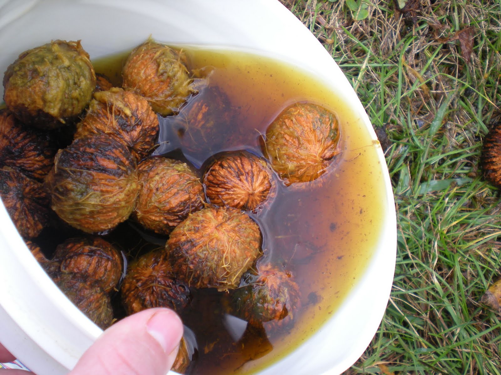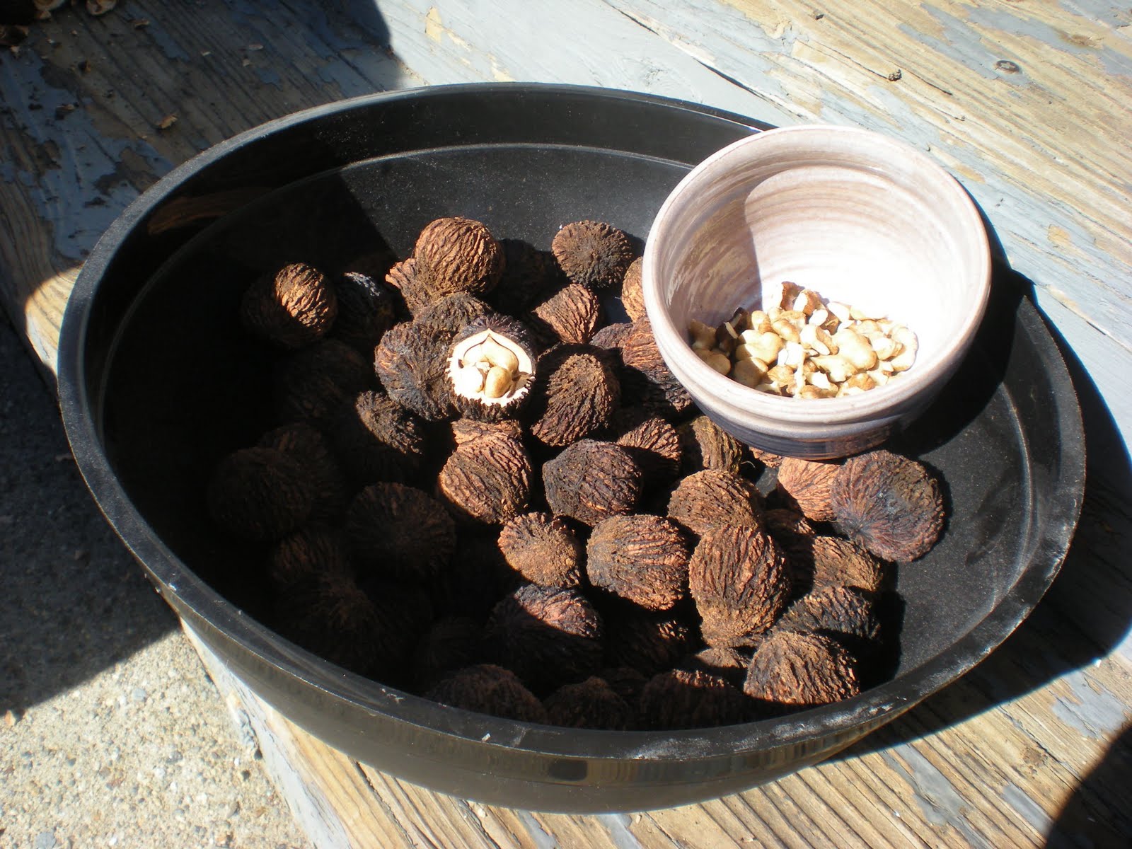 The nuts are inside a thick green husk that must be removed, and is often infested with worms. You should wear gloves to remove the husk, as it will stain everything it touches. Inside is the deeply furrowed nutshell. It is best to wash the nuts and scrub them with a wire brush at this point to remove any leftover husk. The nuts are easier to remove from the shell after they have aged and dried awhile. Robert used the backside of an axe to crack them open and picked out the meat. Gillian ate the nutmeat almost as fast as it was shelled! The flavor is different from commercial walnuts, and black walnuts have a very high oil content. The nutmeats can be added to recipes, eaten raw, made into nut butter, or boiled to obtain the walnut oil. We just ate them raw as a treat.