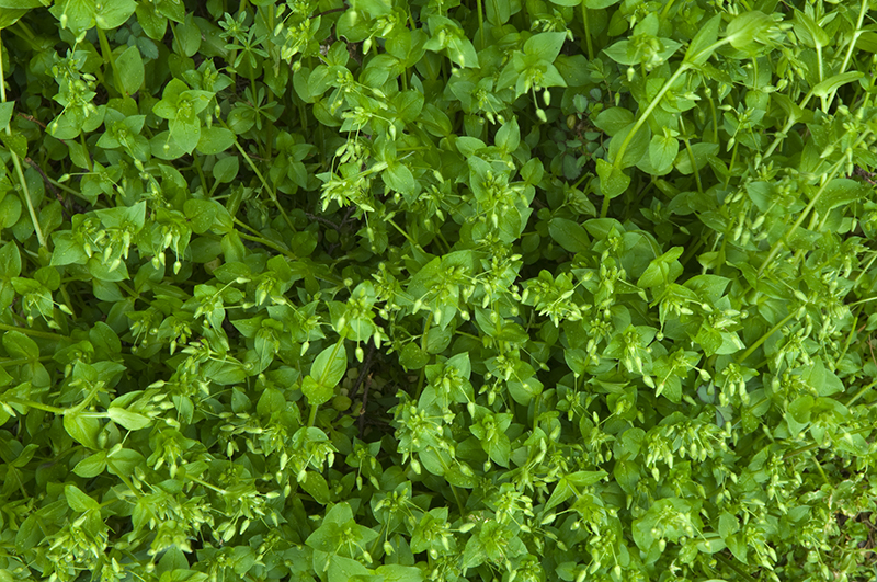 Tiny, white flowers bloom in clusters at the tips of the plant, and drop tiny brown seeds. At first glance, it might look like there are 10 petals on the flowers, but there are actually 5 deeply split petals. Chickweed usually is a ground hugging plant, meaning it needs lots of extra washing to get the dirt off.