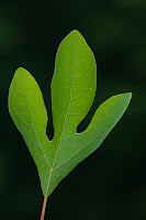 In the spring, sassafras produces tiny, yellow five-petalled flowers as the new leaves unfurl. There are three distinct leaf shapes growing on the sassafras tree- an oval, a mitten-shaped leaf, and a triple-lobed leaf. In the summertime, sassafras will produce hard, black berries on a red, cup-shaped stem that birds like to eat. The berries are not abundant, and we rarely ever see them. Late in autumn, the sassafras leaves turn into a lovely rainbow of red, orange and yellow before falling.