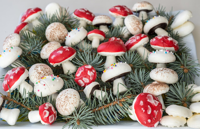 The meringue mushrooms are always fun to make too, with just some egg whites and sugar, and decorated with melted chocolate and candy melts. This year I made some oysters (Pleurotus ostreatus), Amanita muscaria with white gills and red tops, meadow mushrooms (Agaricus campestris) with dark chocolate gills, and one red-capped Russula with a white stem and white gills.