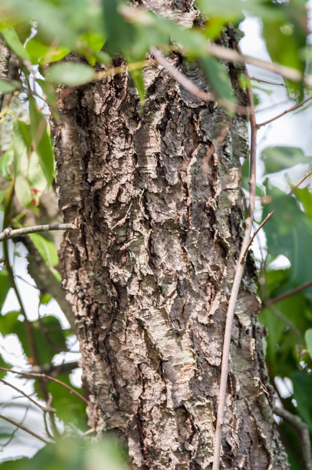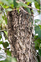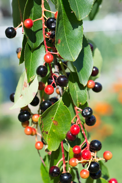 This year's Yule Log cake admittedly came a few weeks after the Yule. We brought it to share at some friend's post-New Year Winter Open House party, since the three of us can't possibly eat the whole cake ourselves. The cake is a vanilla biscuit roulade, filled with a black cherry (Prunus serotina) mousse, frosted with chocolate buttercream, and decorated with chocolate and cocoa nib "bark". You often read in identification manuals that the outer bark of the black cherry tree looks like burnt cornflakes or chips, so I tried to figure out how to represent that in chocolate. I used the same black cherry puree that I had made for ice cream and jam, having a few small containers left in the freezer.
