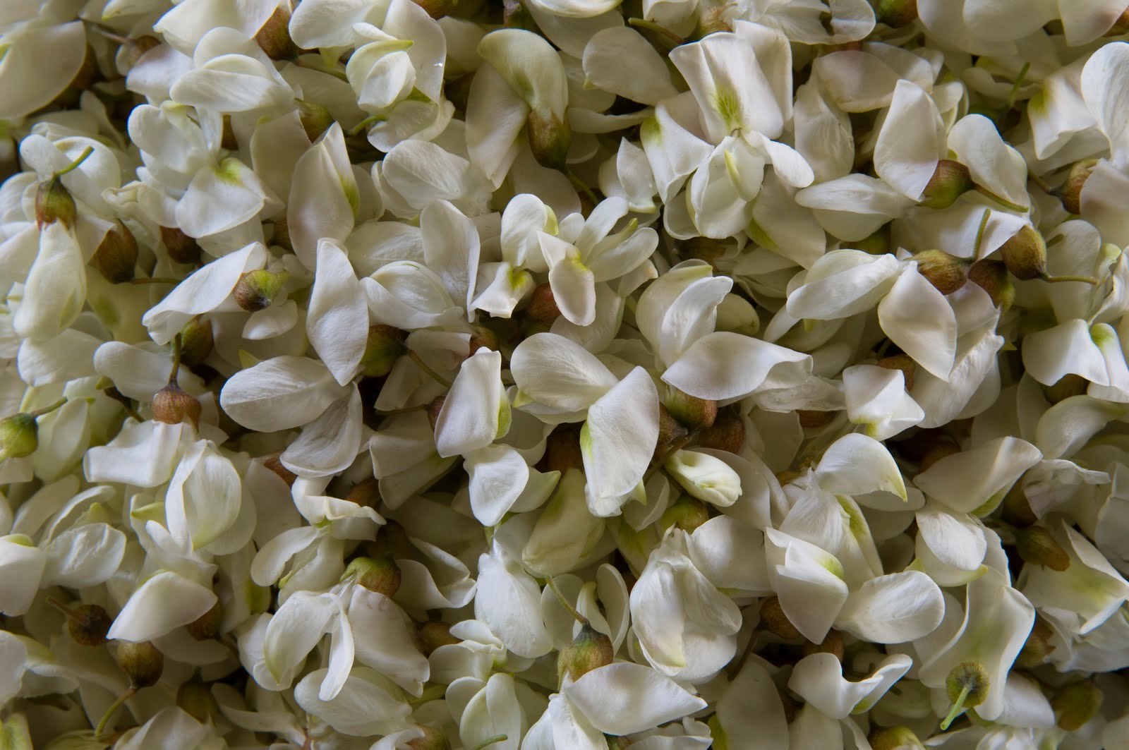 There is about one week in spring when the Black Locust (Robinia pseudoacacia) blooms and we gather the flowers. The smell is sweet like a perfume, and lends itself nicely to sweet foods like fritters and pancakes. The blossoms attract lots of bees, and ants.