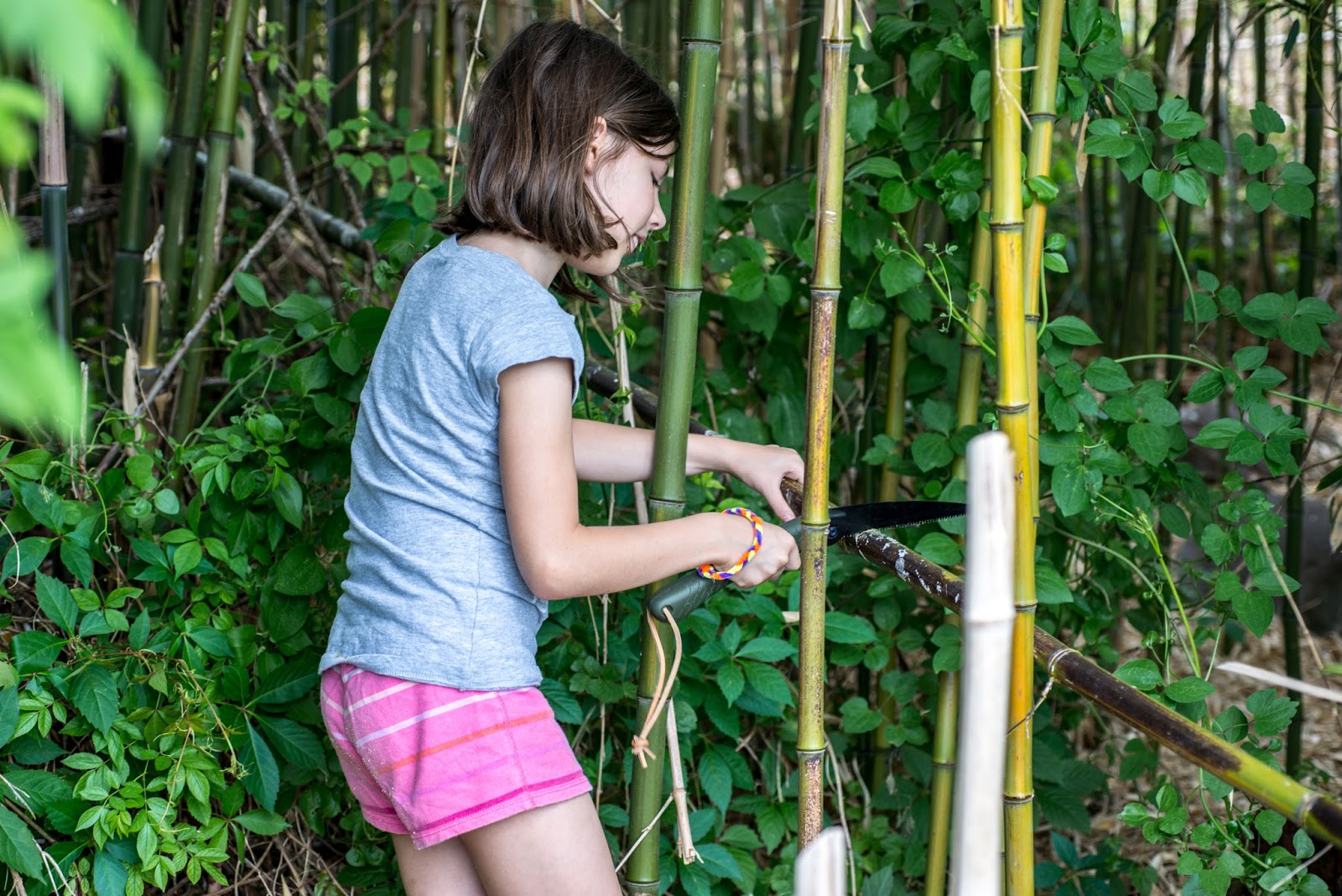 | Gillian using the saw to cut some bamboo lengths for playing |